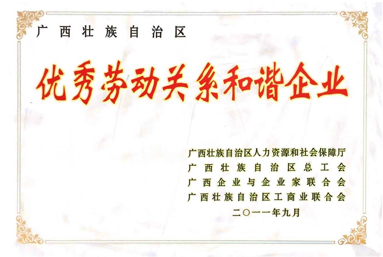 廣西壯族自治區(qū)優(yōu)秀勞動關系和諧企業(yè)